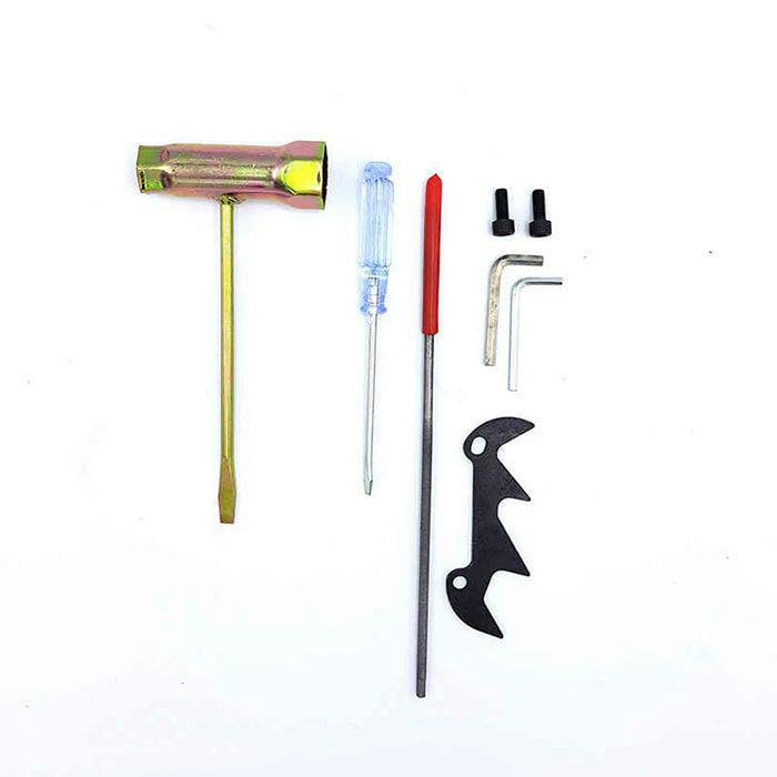به همراه زنجیر 450 میلیمتری ، ساطوری ، مخزن ترکیب سوخت با روغن ، محافظ تیغه و ساطوری ، دفترچه ، سوهان تیز کننده زنجیر ، آچار و اتصالات