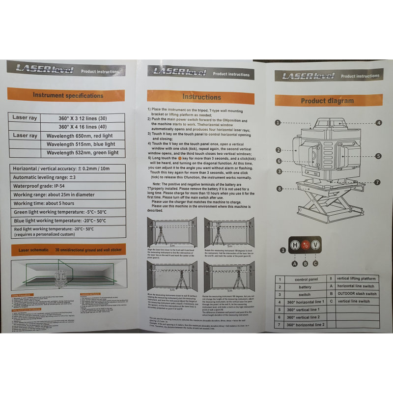 دارای سه خط تراز ۳۶۰ درجه با نور لیزر سبز رنگ جهت دید بهتر امکان استفاده با باتری لیتیوم دارای سیستم پاندولی هوشمند قابلیت تنظیم شدت تابش لیزر در ۵ حالت مختلف دارای طراحی ارگونومیک بدنه تمام پوشیده شده از TPR دارای پایه آهنربایی چند کاره دارای سیستم پاندولی هوشمند برای ترازشدن اتومات تا ۳.۵ درجه سایز رزوه روی براکت جهت نصب روی انواع سه پایه: ۱.۴ اینچ مجهز به خشاب باتری، قابلیت استفاده در حالت پالس برای استفاده از گیرنده امواج در فواصل زیاد مجهز به باتری لیتیوم و مجهز به حالت چشمک زن در وضعیت غیرتراز دارای پایه آهنربایی با قابلیت تنظیم میلیمتری ارتفاع و حرکت در جهت افقی توسط پیچ های روی براکت آهنربایی امکان نصب روی سه پایه دارای محافظ پلاستیکی روی محافظ دیودها دارای لیزر به رنگ سبز از نوع Class I بهترین انتخاب جهت سقف کاذب و پنل های سه یعدی میزان خطای احتمالی این دستگاه ۳ میلیمتر در هر ۱۰ متر است دارای میزان دامنه اندازهگیری ۲۵ متر (با کمک آشکارساز تا ۵۰ متر) میباشد امیدواریم از استفاده از این دستگاه لذت ببرید